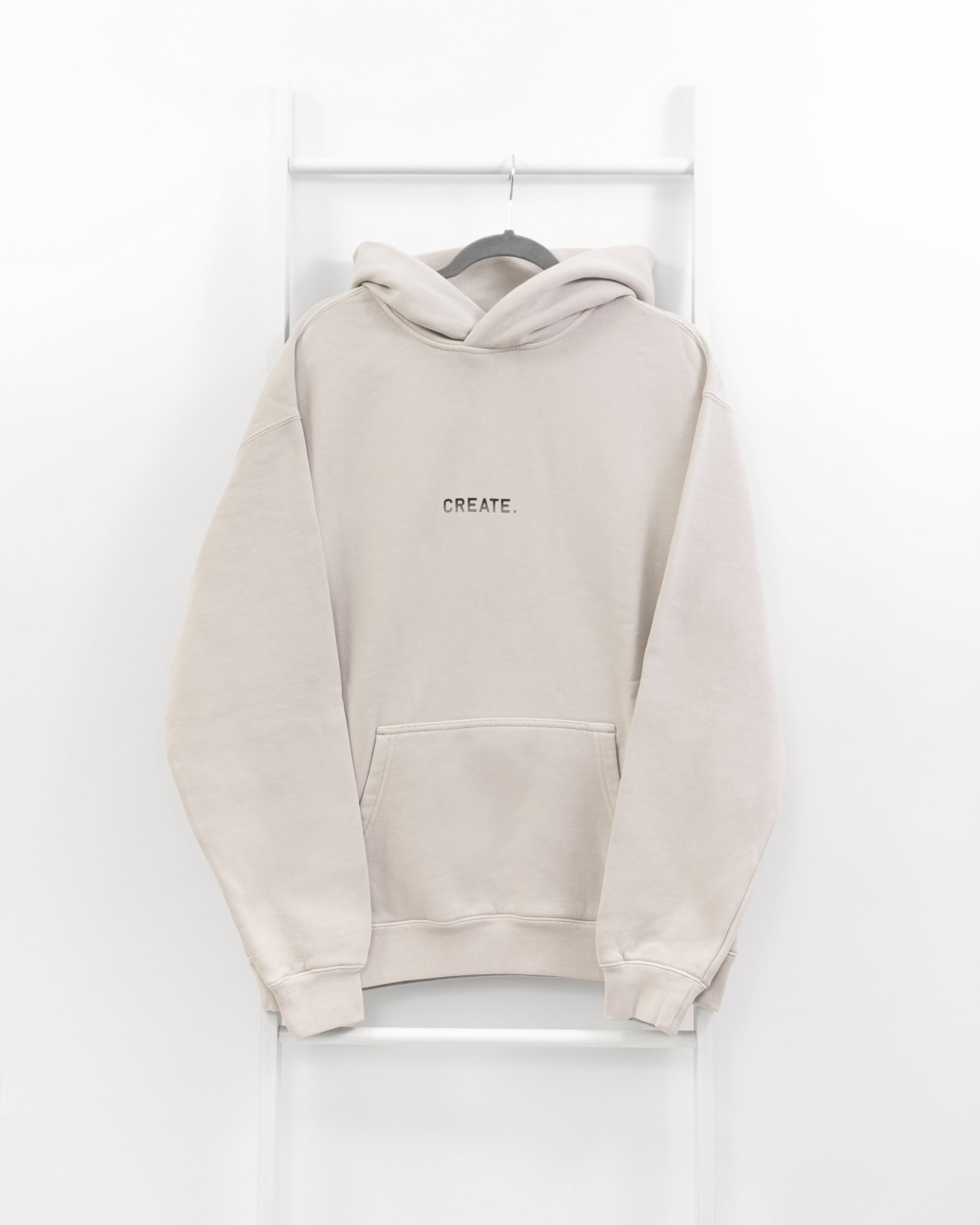 The CREATE.  Essentials Faded Hood.  80% 320 GSM cotton / 20% recycled polyester. No draw chord.   Order your usual size for a   relaxed / slightly oversized fit.