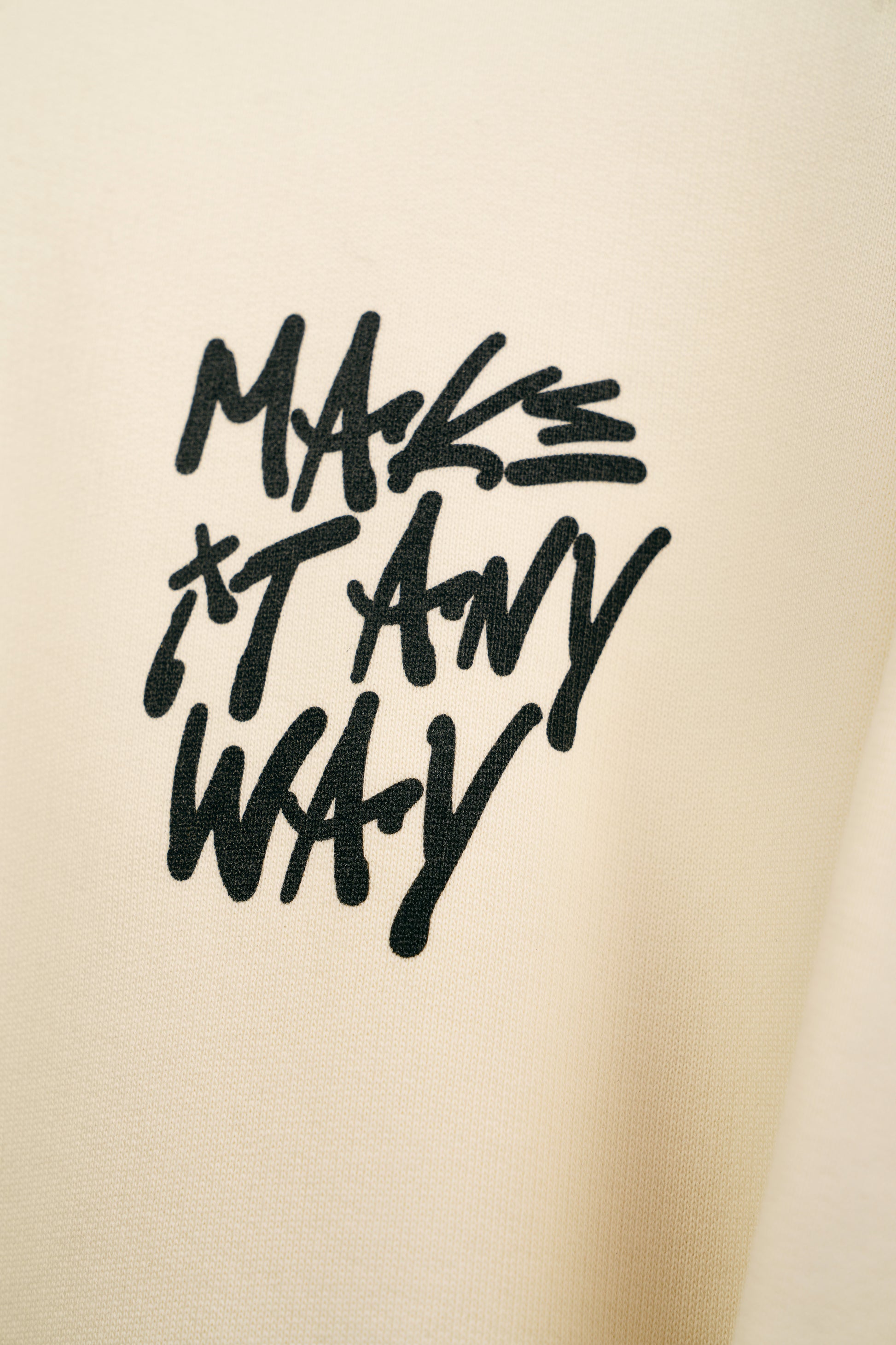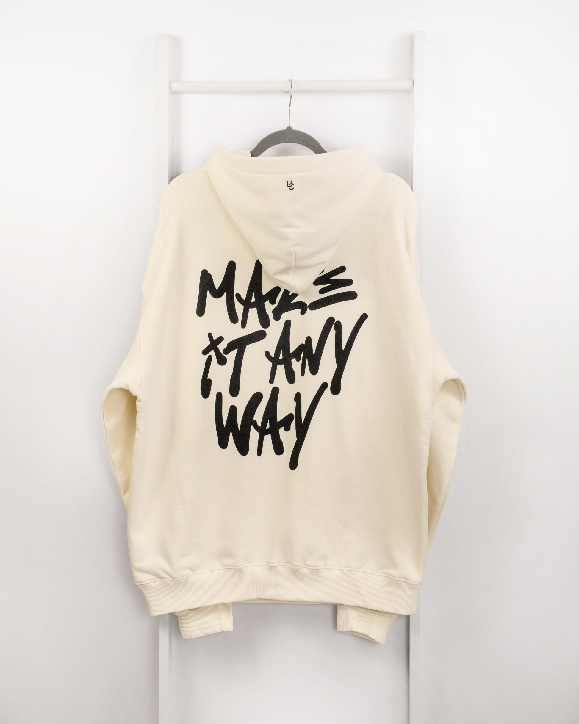 Make It Anyway print front left chest. UC logo print front right chest. Large Make It Anyway print back.  Small UC logo detailing on hood.  Perfect for keeping cosy in the studio, on your travels or outside on Spring Summer evenings.
