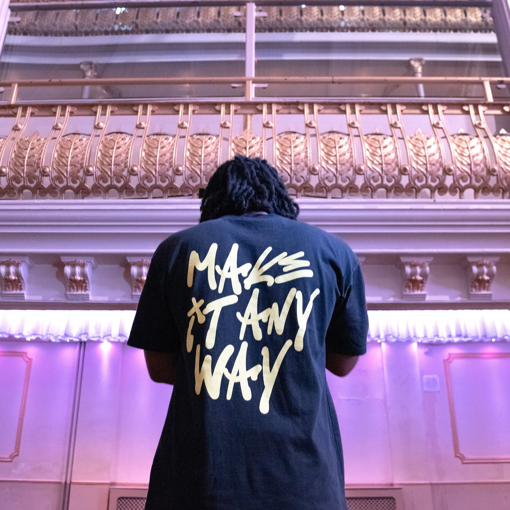 Make It Any Way print front left chest. UC logo print front right chest. Large Make It Any Way print back.    Comfort, identity, statement.