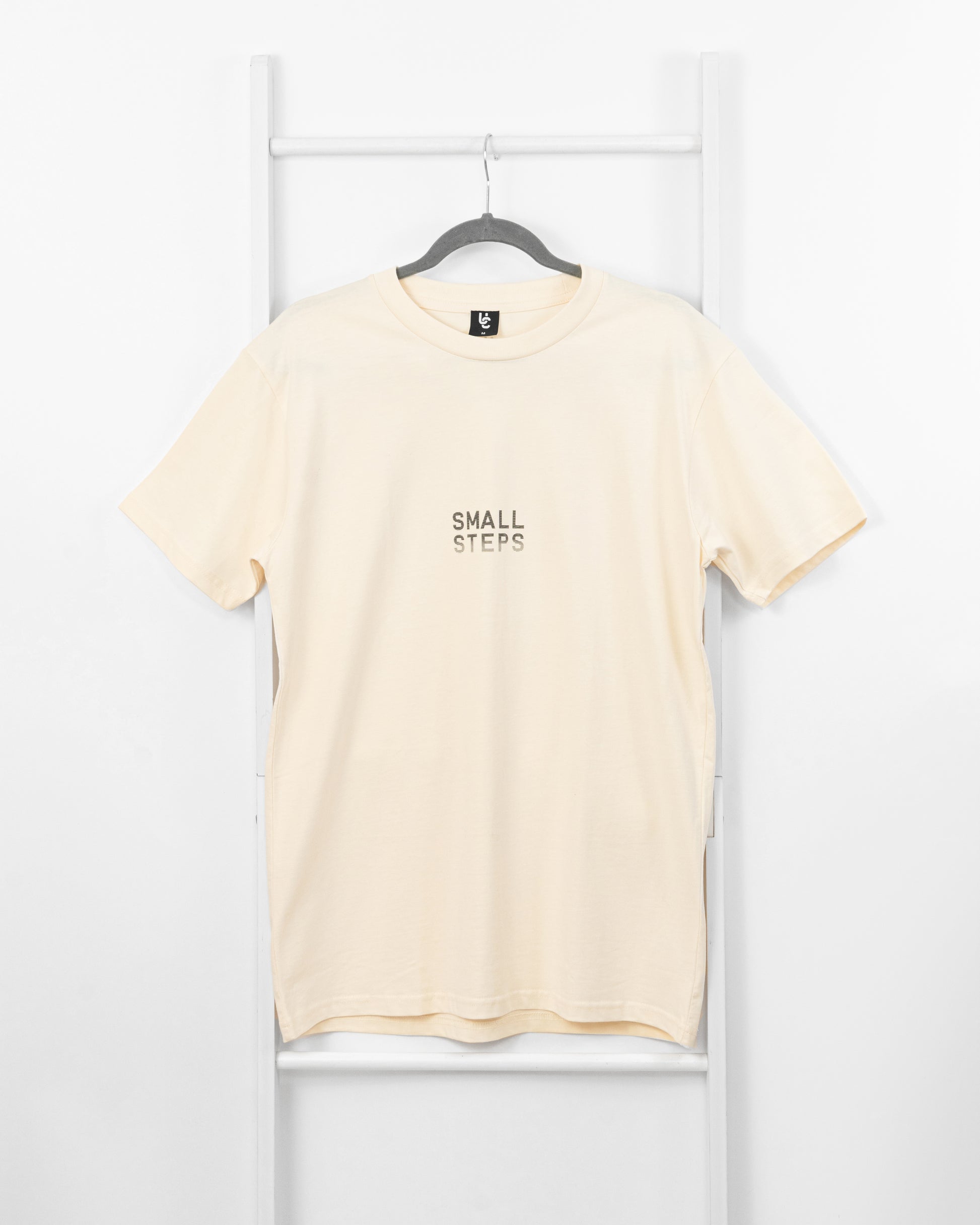 SMALL STEPS centre chest gradient print. UC back hem print.  Simple expression.