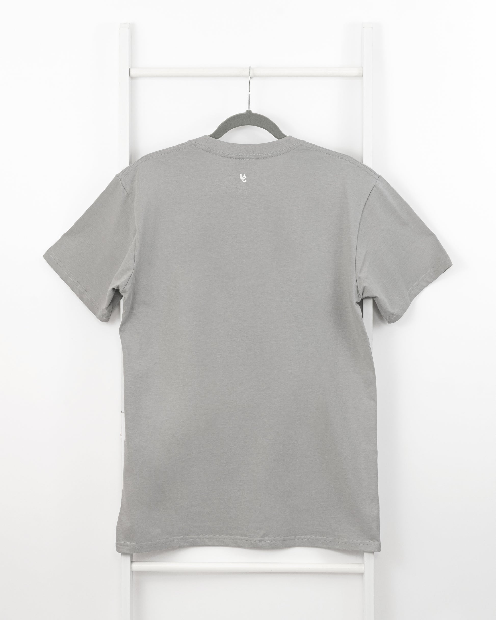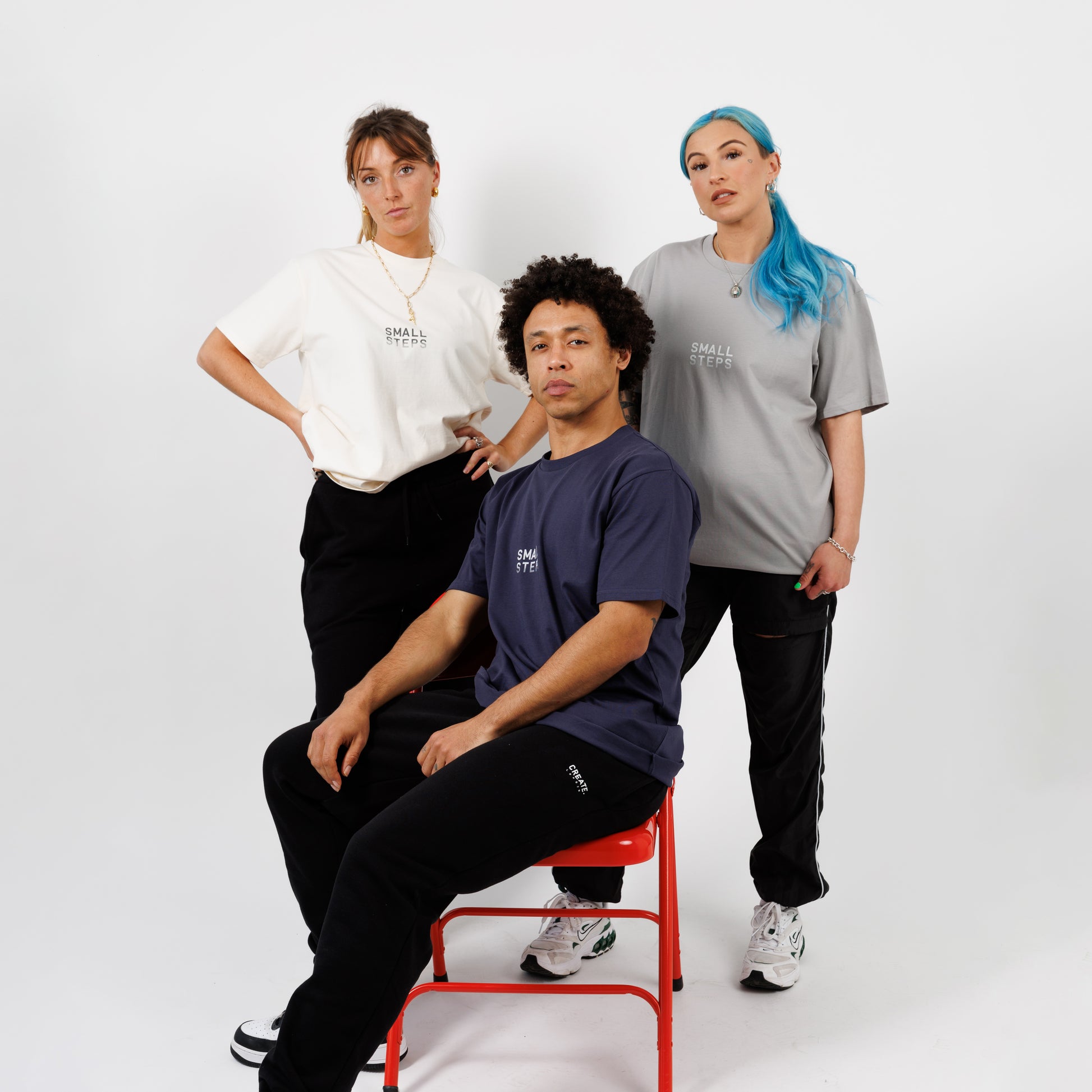 The Small Steps Essentials T-shirt.  100% 220 GSM cotton.  Relaxed fit, order in your normal size.
