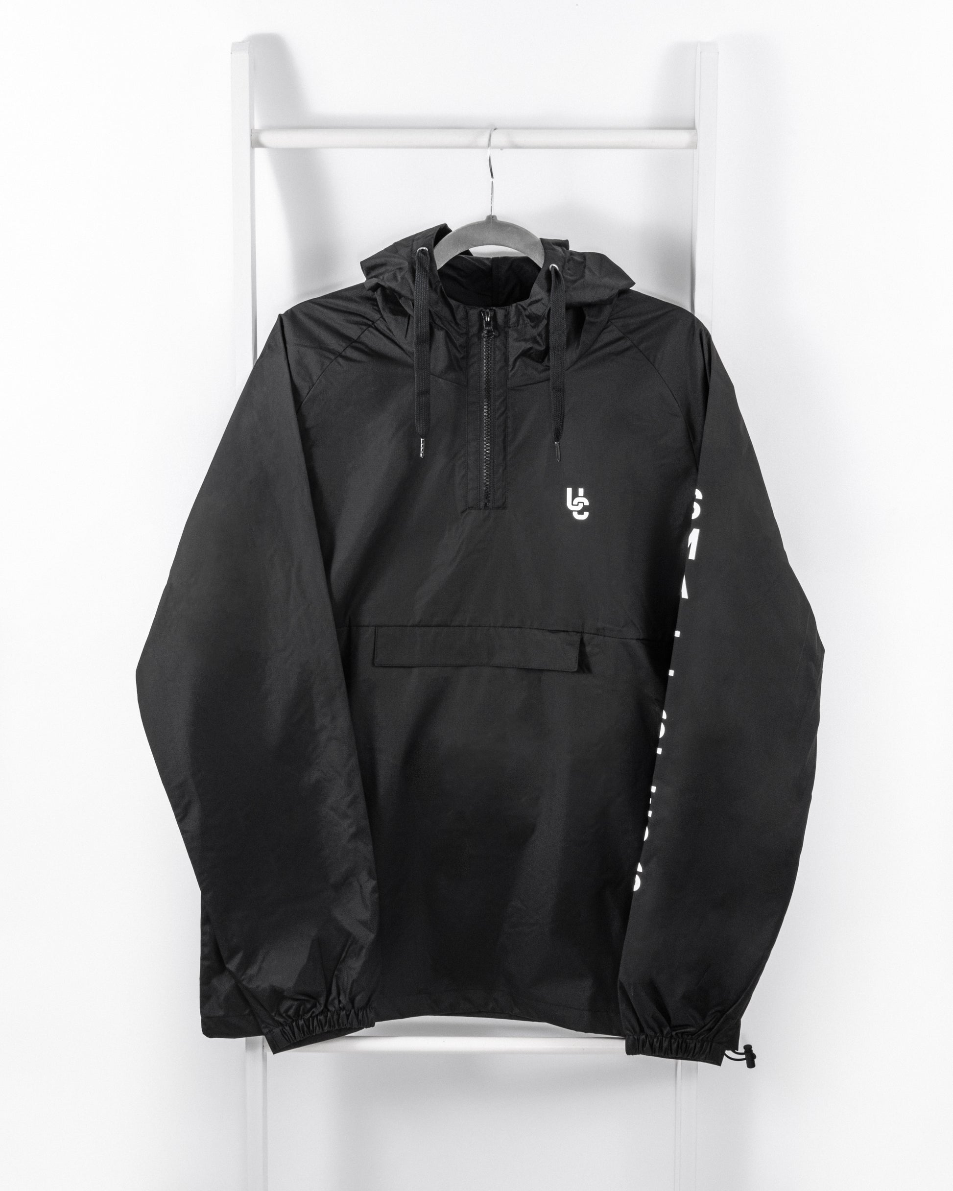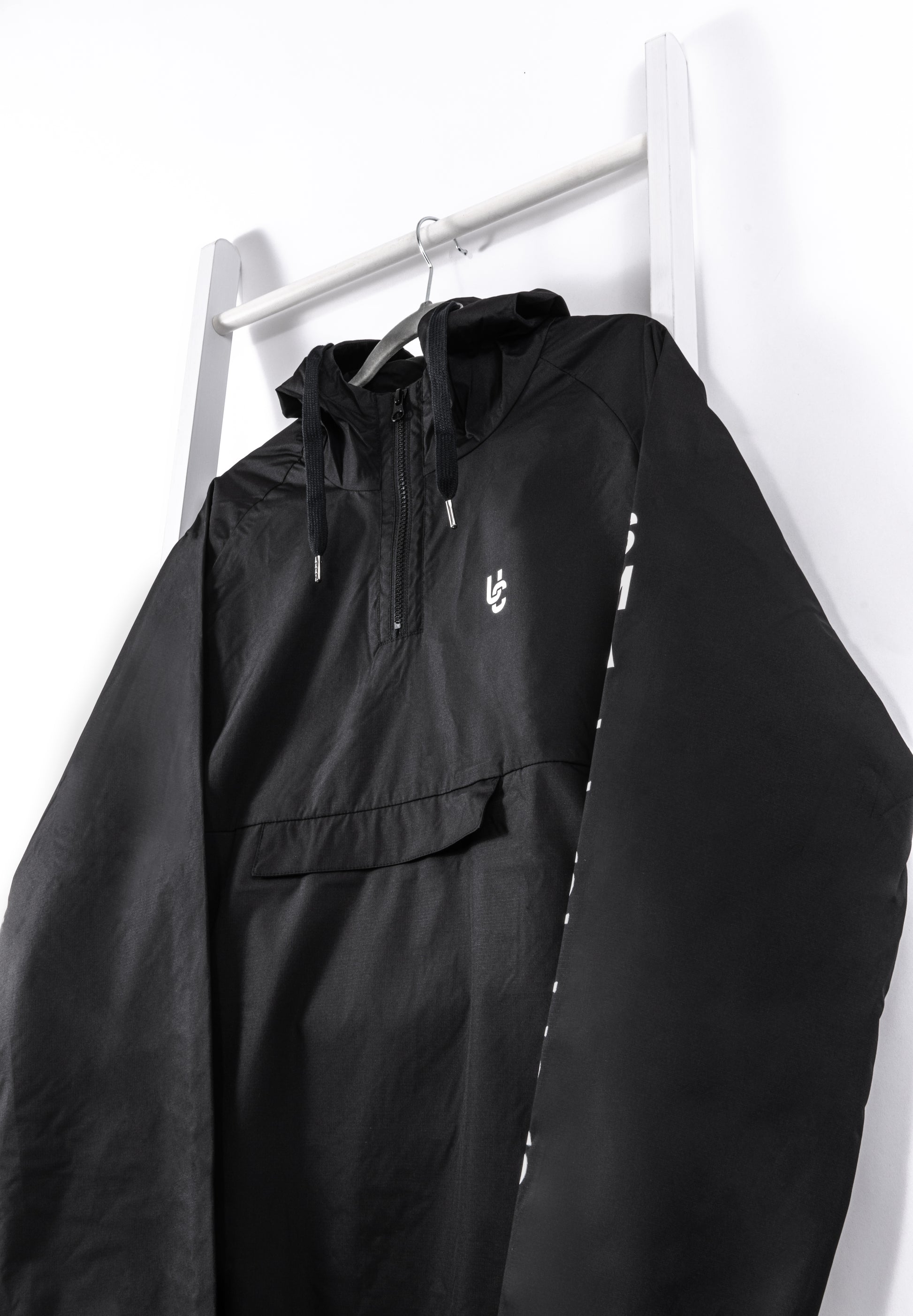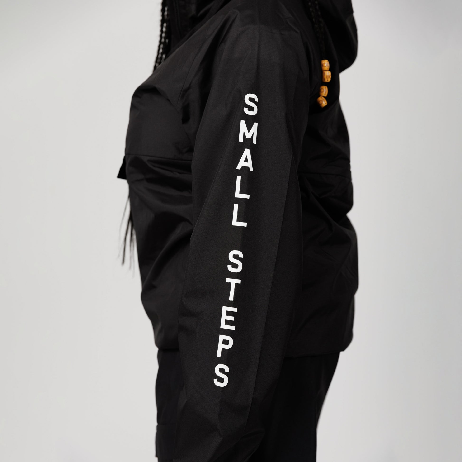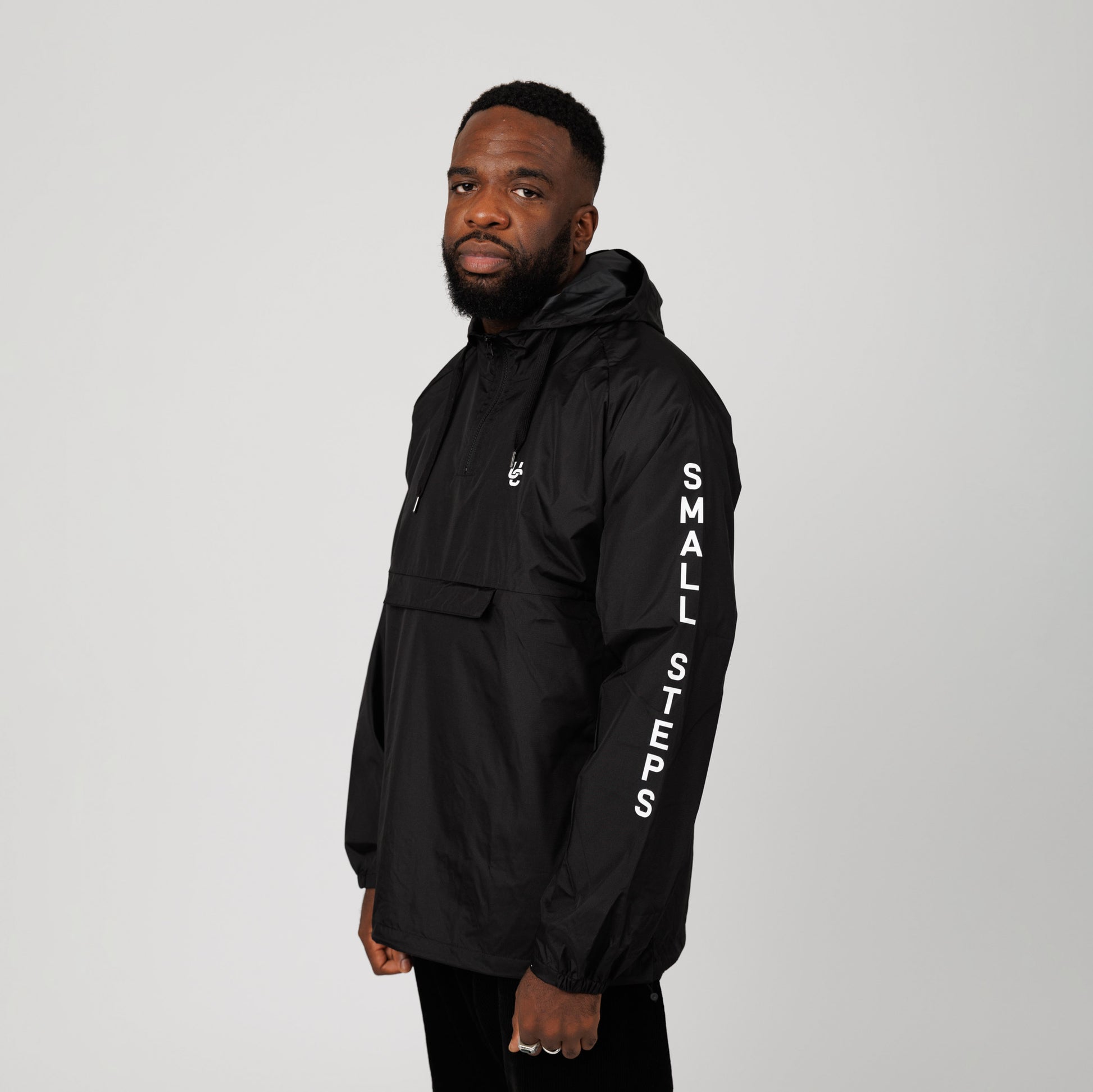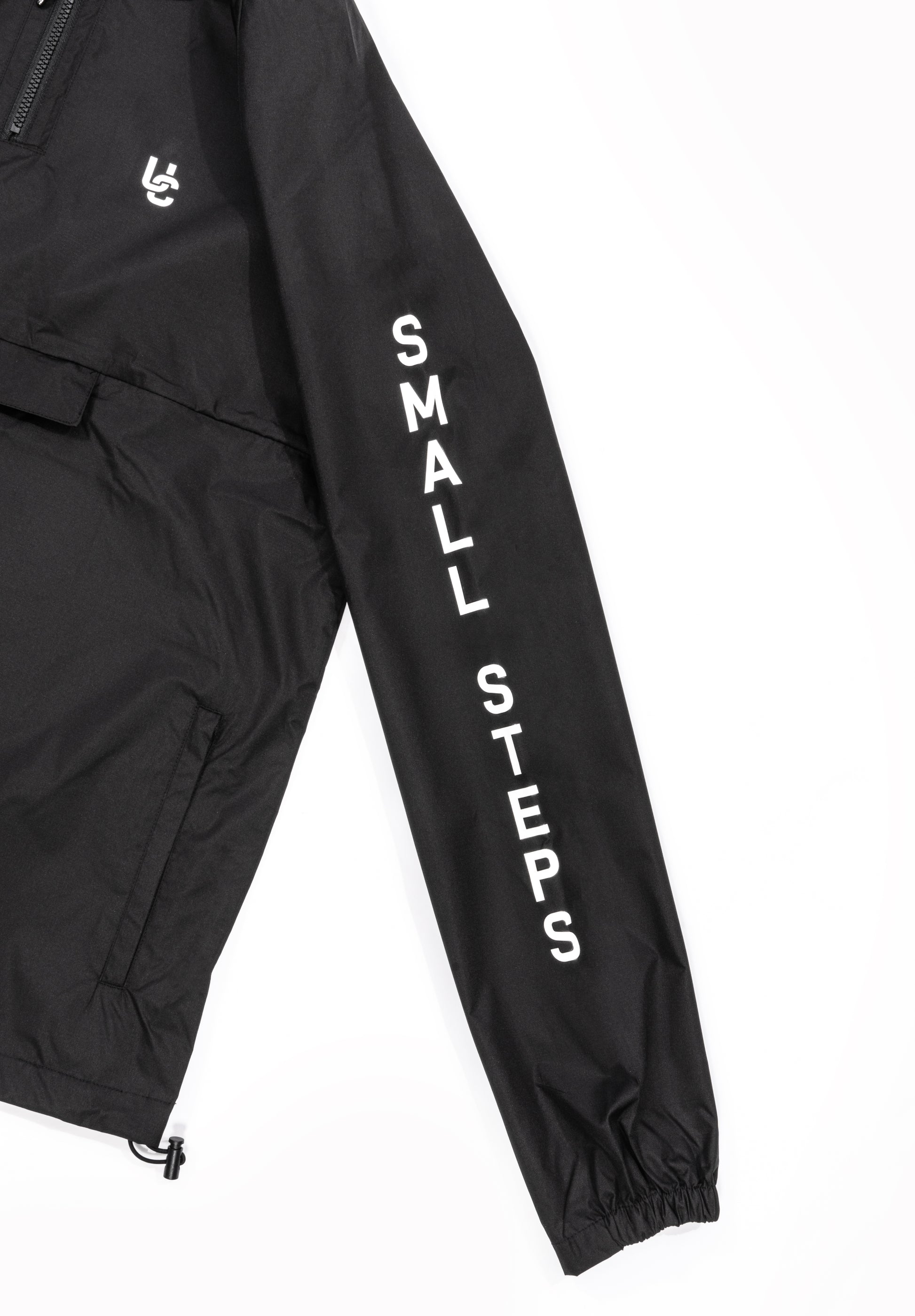The SMALL STEPS Windbreaker.  Light weight, 90 GSM 100% Recycled Polyester.  Water resistant.  Pullover half-zip.  Regular fit.  Adjustable draw chords at hem and hood.